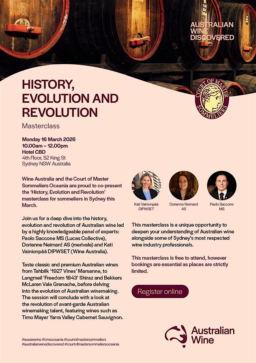 Wine Australia and the Court of Master Sommeliers Oceania are proud to co-present the ‘History, Evolution and Revolution’ masterclass for sommeliers in Melbourne this March.