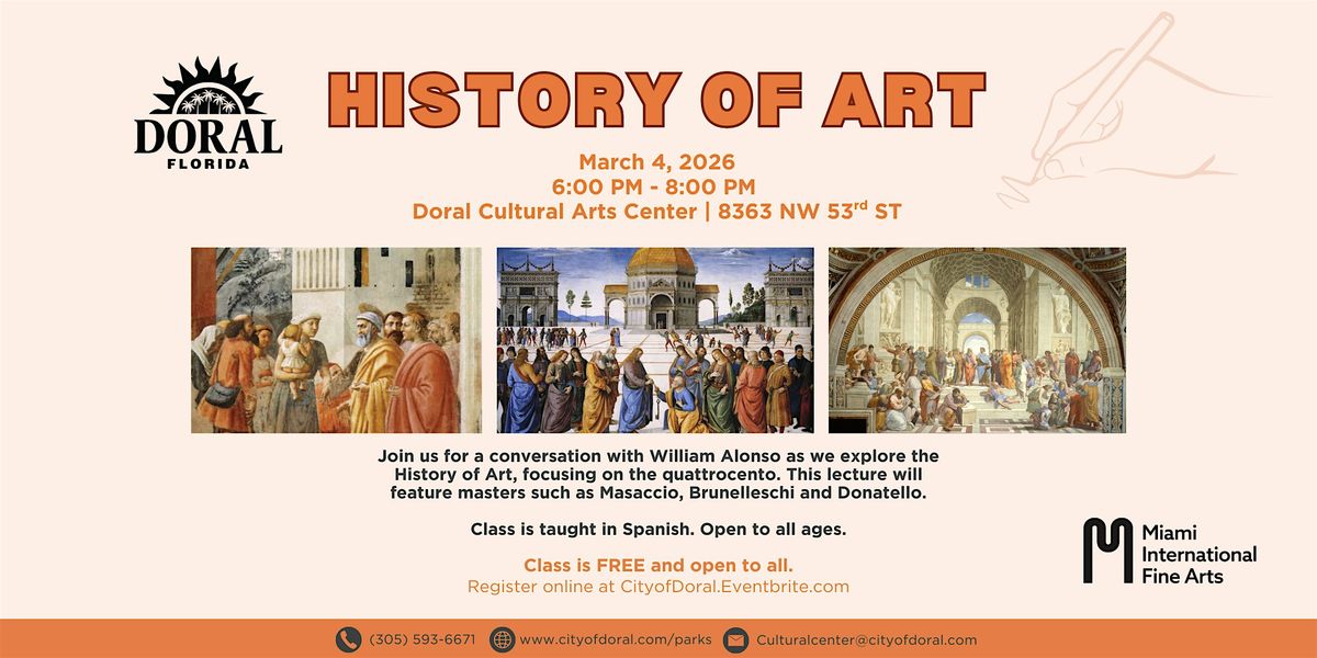 Acompáñenos en una enriquecedora exploración del Quattrocento en esta dinámica conferencia en español con William Alonso. Descubra cómo maestros como Masaccio, Brunelleschi y Donatello impulsaron una transformación cultural que cambió el rumbo de la historia del arte. A través de poderosos recursos visuales y una narrativa cautivadora, obtendrá una nueva perspectiva sobre las innovaciones que definieron el Renacimiento temprano. Abierto a todas las edades y perfecto para quienes aman el arte, la historia o simplemente desean aprender algo nuevo.