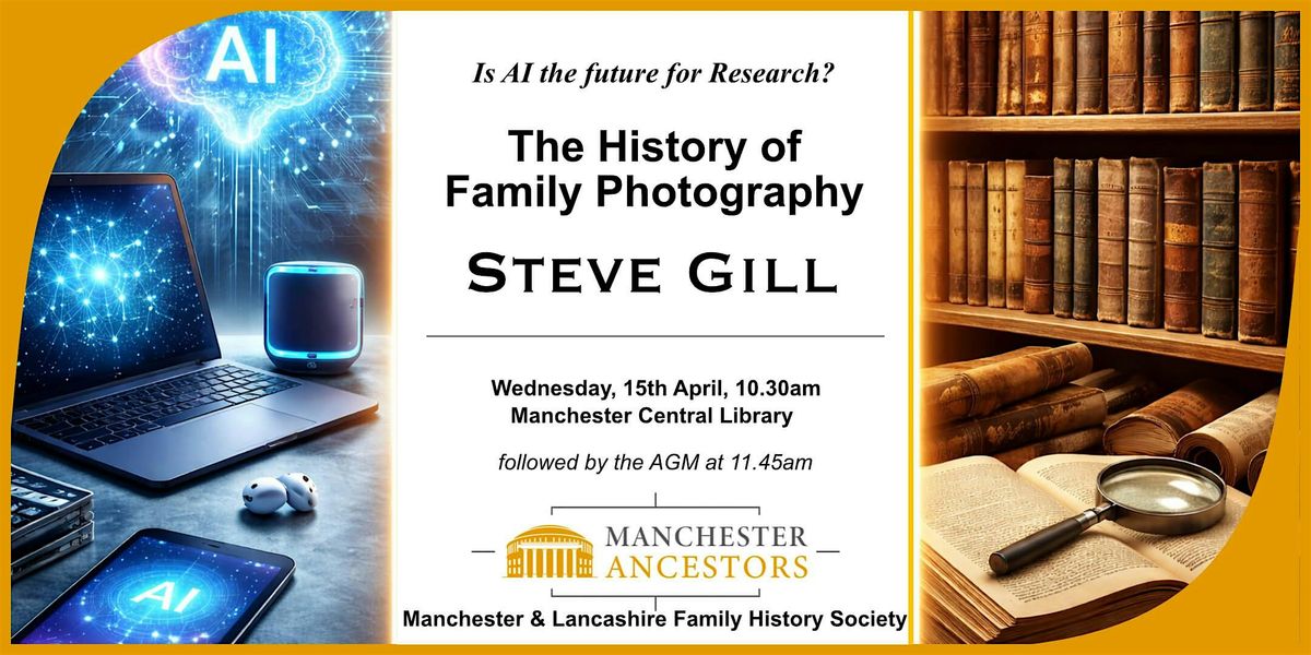 Steve Gill returns to Manchester Central Library to illustrate the history of family photography - always an enjoyable talk as Steve draws on his experience of both photography and photograph restoration. Steve will also look at AI - is it the future for research? Followed by our Society's AGM