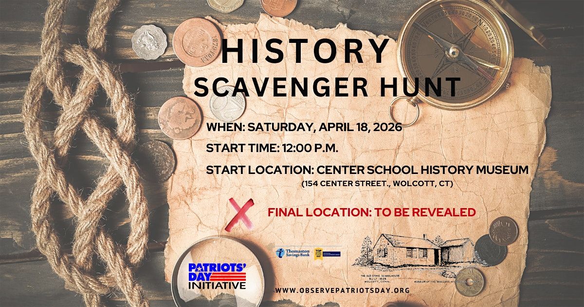 This event will take place on Saturday, April 18th at 12 noon. Teams will meet at the Center School History Museum at 154 Center Street Wolcott, CT. The final location will be revealed with provided clues from each site.