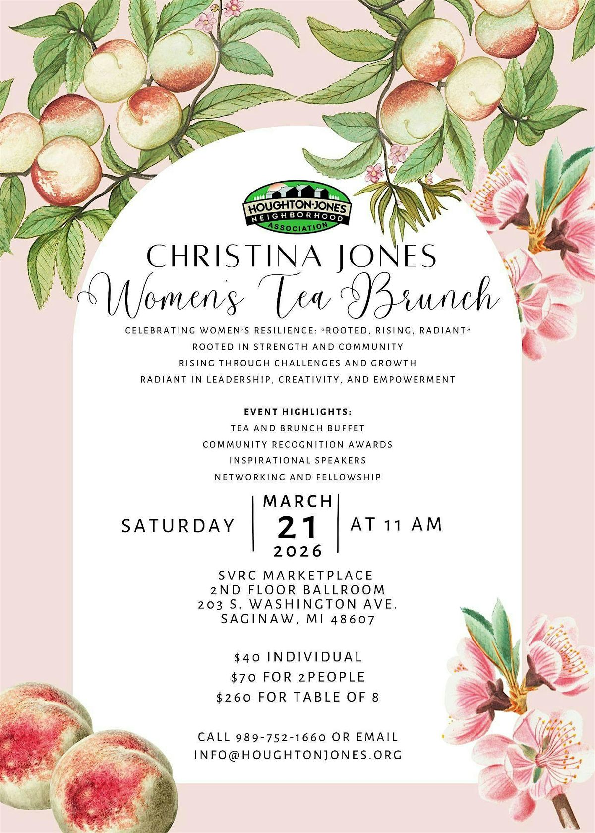 This year’s Christina Jones Women’s Tea Brunch will take place on Saturday, March 21, 2026, from 11:00 AM to 2:00 PM in the 2nd Floor Ballroom of the SVRC Marketplace, located at 203 S. Washington Ave., Saginaw, MI.