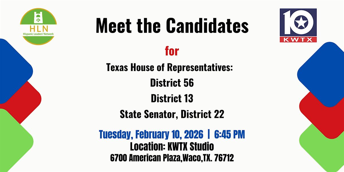 Meet the candidates for Texas House Districts 56, 13 & 22. Join HLN and KWTX on Feb. 10 at 6:45 PM in Waco.