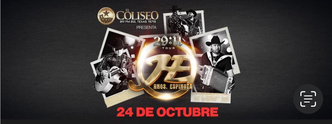 Are you ready to experience Hermanos Espinoza like never before? With chart-topping hits like DIOS POR DELANTE, Prueba De Fuego and Vision De Tunel and 223.3K+ devoted fans, Hermanos Espinoza is taking over El Coliseo this Friday, October 24, 2025, and trust us, you don't want to miss this.