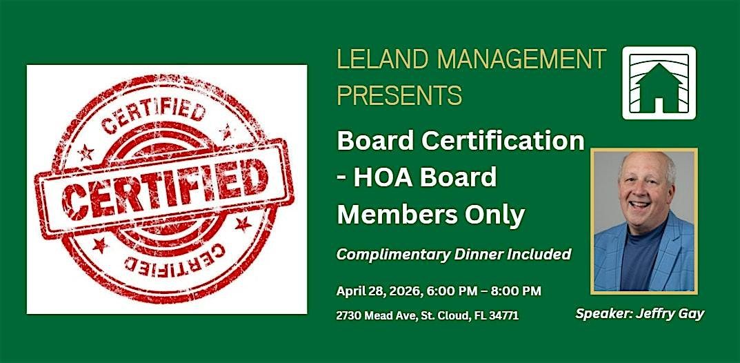 Leland Management is pleased to offer this complimentary in-person course for Homeowner Association Board Member Certification. This course meets Florida State requirements for new Board Member certification and is also ideal for anyone looking for the knowledge and tools necessary to make their job as a Board Member easier. Course, materials, and certificates are provided at no cost. Presented by Jeff Gay, Director of Leland Management.