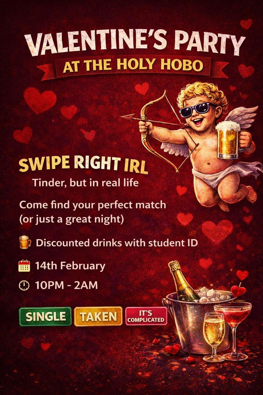 "💖 Celebrate love and friendship this Valentine's with FREE tickets to Hobo's unforgettable event! 🎉 Grab yours now and get ready for a night filled with fun, laughter, and memories! Don’t miss out! ❤️ #HoboValentines #FreeTickets"Don’t forget to wear either of the following: