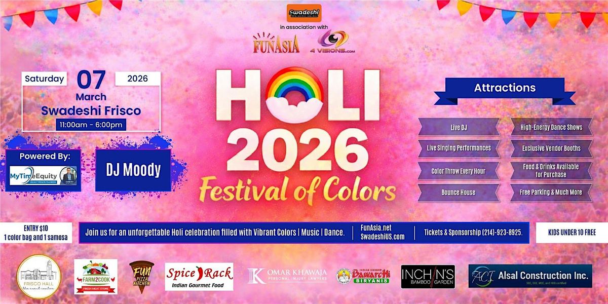 Celebrate Holi 2026 on March 7 (11 AMβ6 PM) at Swadeshi Frisco with DJ Moody, vibrant colors, music, delicious food, and nonstop family fun!About this Event