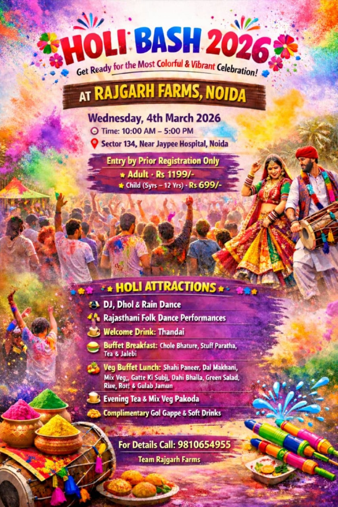 Get ready to celebrate the most colorful, vibrant & joyful Holi party of 2026 at Rajgarh Farms, Noida!