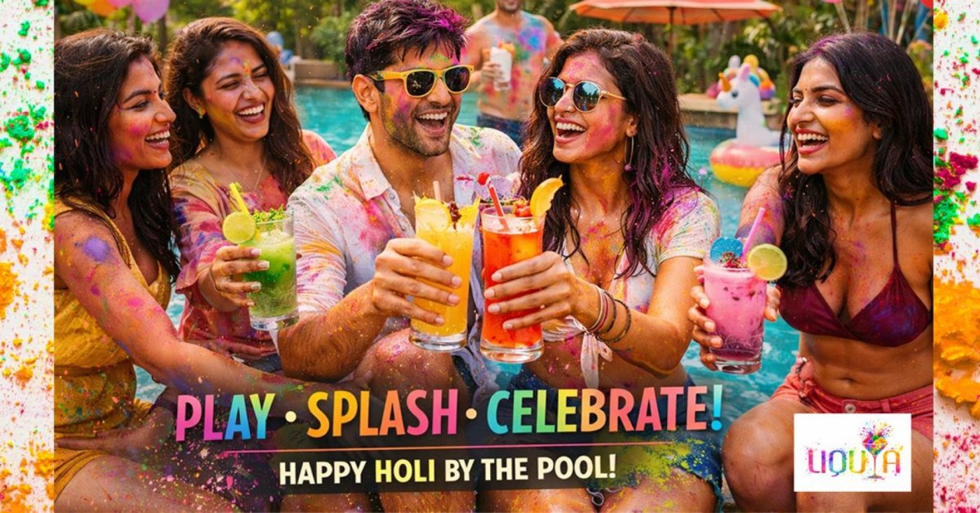 Holi by the Pool at LIQUA - 3rd March 2026, brings fun with its famous Open Air Pool Party, Unlimited Organic Colours, Unlimited Live Food Counters, Unlimited Thandai Counter, Non-stop music and much more only @ Rs 1499/- per adult(children 13 years onwards), kids from 5 years - 12 years @ Rs 749/-. Timing: 11:30 am - 4:30 pm. T&C Apply