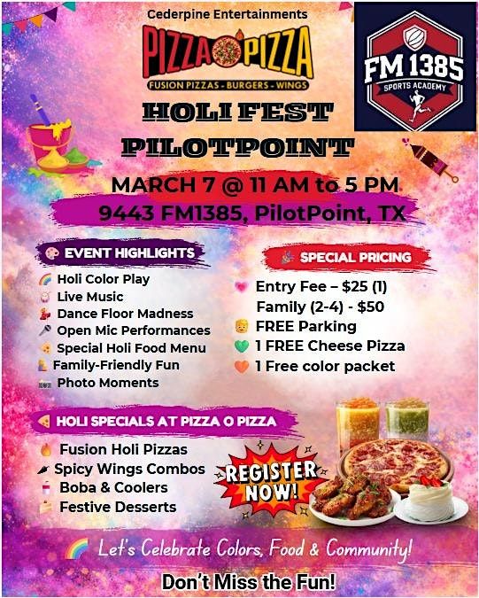 Get ready to splash into fun at Holi Fest, the ultimate Holi party! Join us in person for a colorful day full of vibrant powders, joyful music, and non-stop dancing. It's the perfect chance to celebrate with friends, make new memories, and embrace the spirit of Holi like never before. Don't miss out on the fun, colors, and good vibes — let’s make this Holi unforgettable!