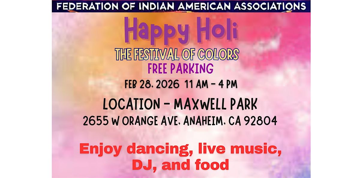 Come join us for a vibrant celebration at Maxwell Park! Get ready to immerse yourself in a sea of colors, music, and laughter. Don't miss out on the opportunity to create lasting memories with friends and family to enjoy vibrant Indian music, delicious food, and, of course, the lively colors! See you there! Purchase tickets and colors from Eventbrite.