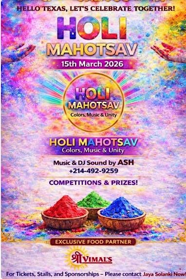 Come splash colors, dance, and feast at HOLI MAHOTSAV 2026 – the ultimate fun in person!About this Event