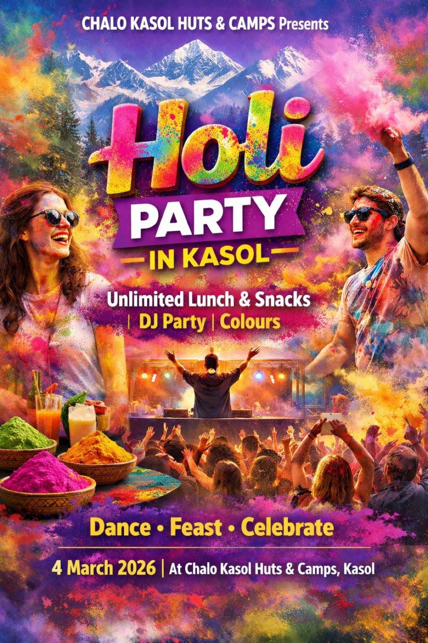 Chalo Kasol Huts & Camps is hosting an electrifying Holi Party on 4th March 2026 in Kasol — and you’re invited!