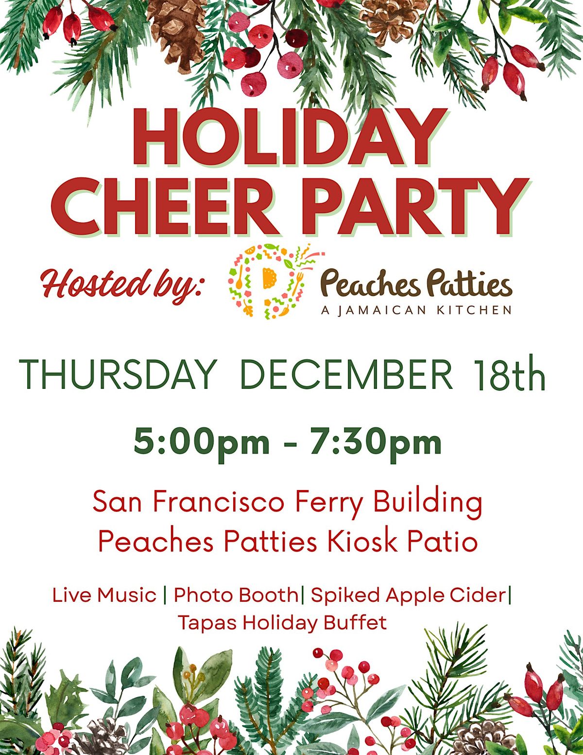 Kick off the holiday season with Peaches Patties at our first-ever Holiday Cheer Party at the iconic Ferry Building! Join us for an intimate evening of festive food, music, drinks, and fun as we celebrate our community, our customers, and the spirit of the season.
