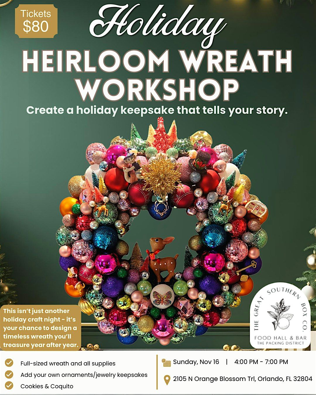 Welcome to the Holiday Heirloom Wreath Workshop! Join us on November 16, 2025 at 4:00 PM (Eastern Time) for a festive crafting experience. Get ready to unleash your creativity and design a unique wreath to adorn your home during the holiday season.