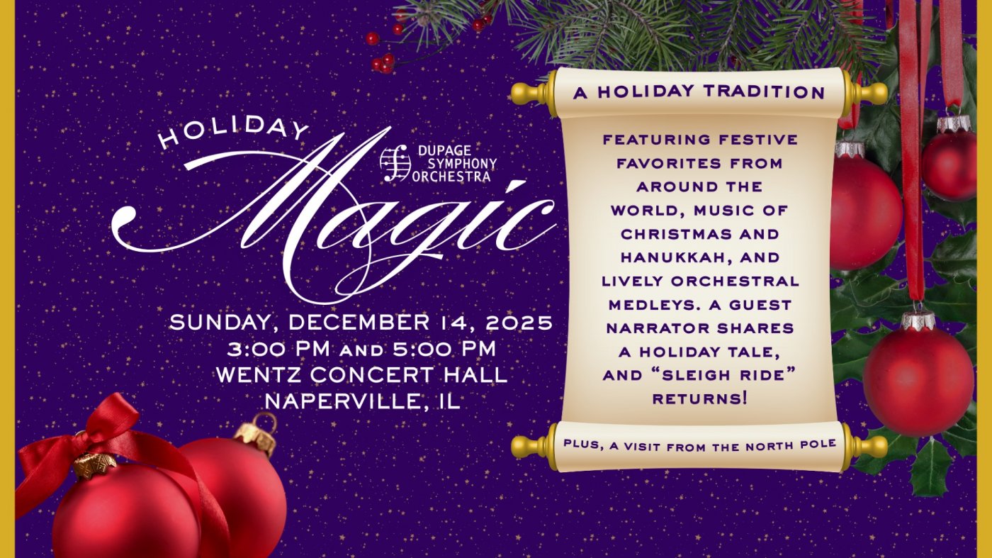 A beloved seasonal tradition the DuPage Symphony Orchestra’s annual holiday concert showcases an array of holiday favorites from around the world. A variety of religious and cultural traditions representing both Christmas and Hanukkah are celebrated with lively medleys and fresh orchestral arrangements. A special guest narrator joins the DSO to relate a charming holiday tale. And who knows: perhaps that special someone will appear at Wentz Hall once again to lead a rousing rendition of Leroy Anderson’s Sleigh Ride!