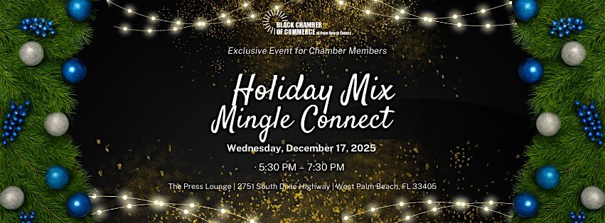Join us for an evening of festive networking at our Holiday Mix Mingle Connect. This end-of-year mixer brings together active Chamber members, business owners, entrepreneurs, and community leaders for a relaxed and engaging networking experience.