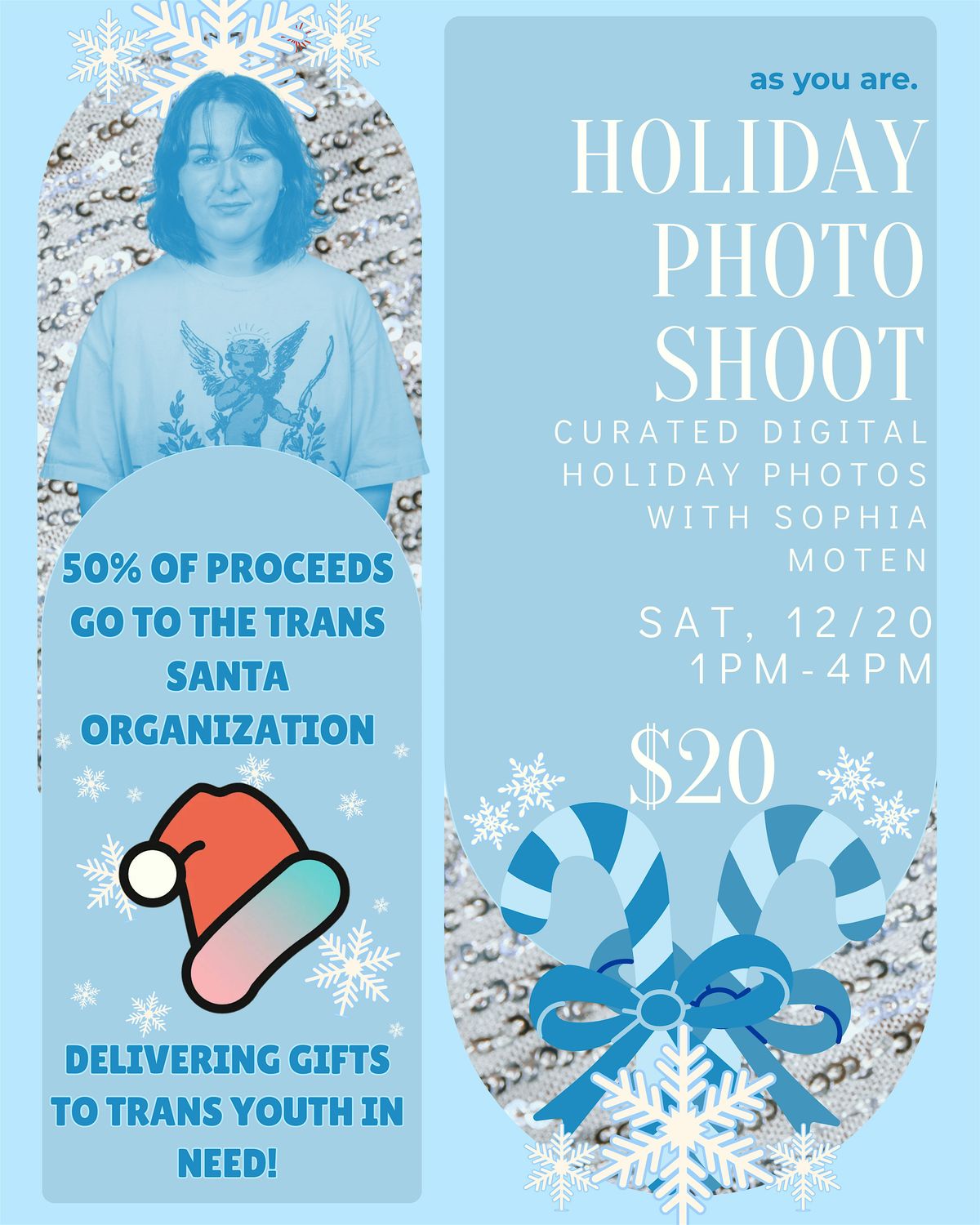 join us for a cozy saturday activity where you’ll have an adorable holiday photo taken by @sophiahmphoto for a good cause!! 50% of the proceeds will be donated to the @transanta organization! who’s mission is to aid trans youth who are unhoused, in foster care, or otherwise without crucial support. We will have a special guest there: jack frost!! who will also be available for your picture portraits 📸 tickets are now available in our linktree!! see you there besties 🥰