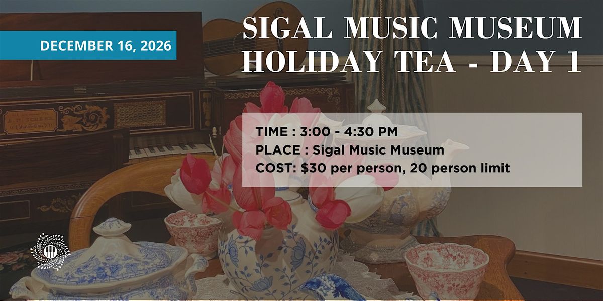 Join Sigal Music Museum for its monthly afternoon tea on December 16, 2026, at 3:00 in the afternoon. Held in the museum, the event will feature savories, sweets, and other fancies! Reserve a table and bring your friends for an afternoon at the museum. Tickets for tea include the price of admission to the museum, so you are invited to explore their exhibits before or after the event.