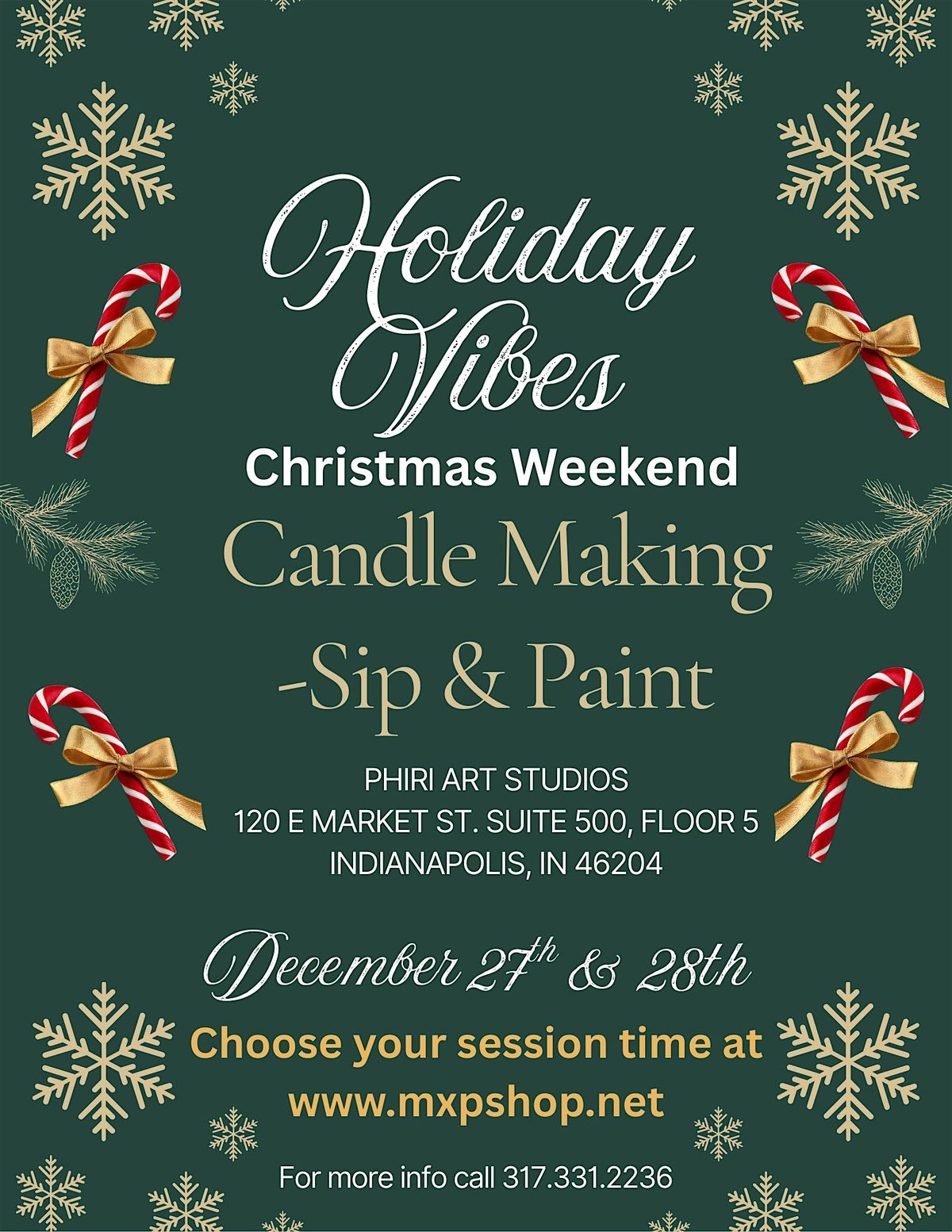 Join us for an unforgettable Holiday Vibes Christmas Weekend in Indianapolis on December 27th and 28th! Choose from three convenient time sessions to craft custom candles while enjoying a relaxed sip and paint experience. Bring your family, favorite beverages, and snacks to create lasting memories together. Perfect for holiday bonding, this workshop combines creativity with celebration—ideal for anyone seeking a unique way to extend the festive season with loved ones.