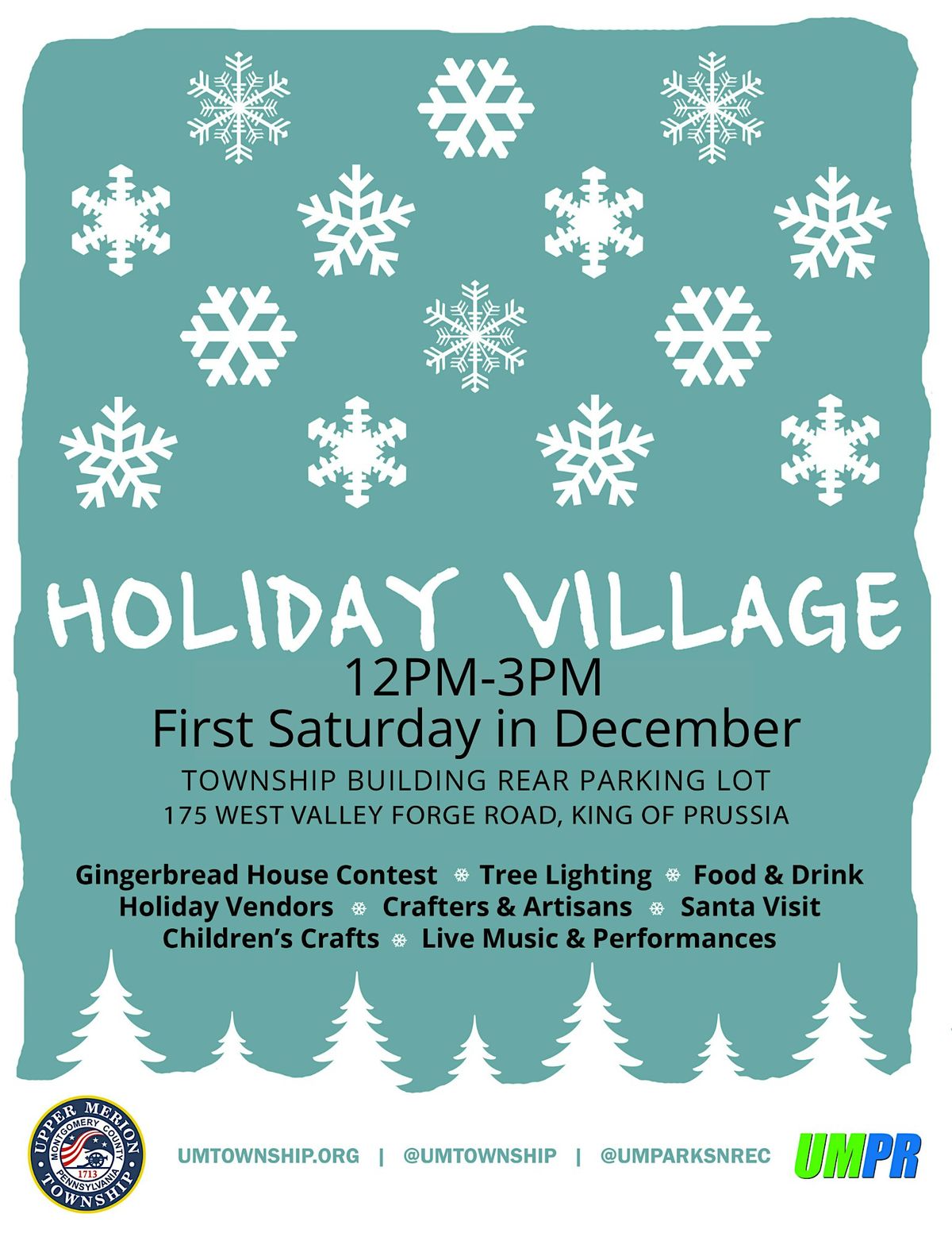 Upper Merion Township's annual Holiday Village event is scheduled for Saturday, December 6th, 2025 from Noon until 3PM in the Township Building Park and Back Lot. The event is free to the public, dog-friendly, and family-friendly! The event will include a variety of craft vendors, a gingerbread house display and contest, live performances, s'mores by a fire, a caricaturist, food vendors, a wine garden, a visit from a special guest (hint: they love cookies and milk!), and much more! This will be a great Holiday shopping event and family celebrations!