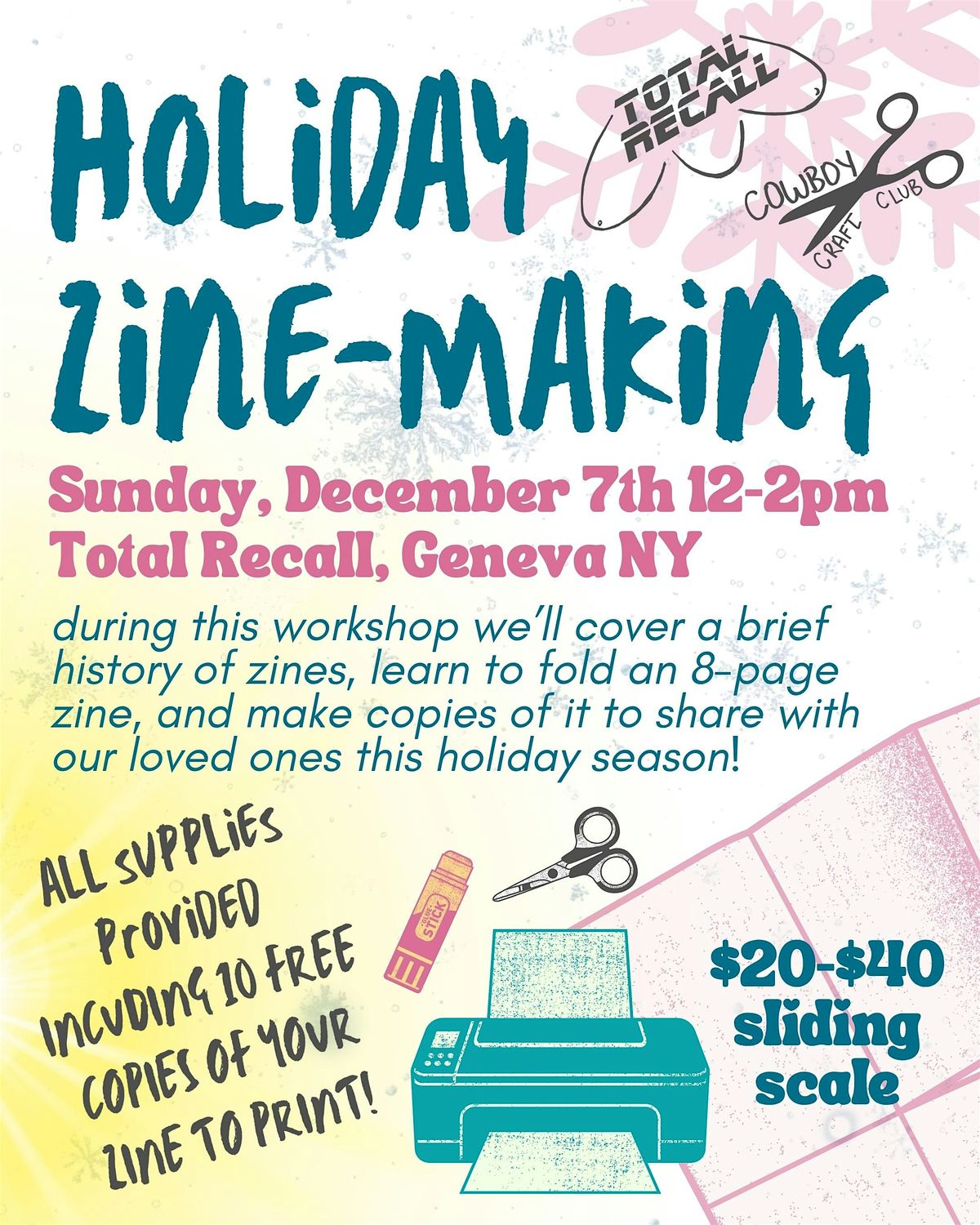 During this workshop we’ll cover a brief history of zines, learn to fold an 8-page zine, and make copies of it to share with our loved ones this holiday season!