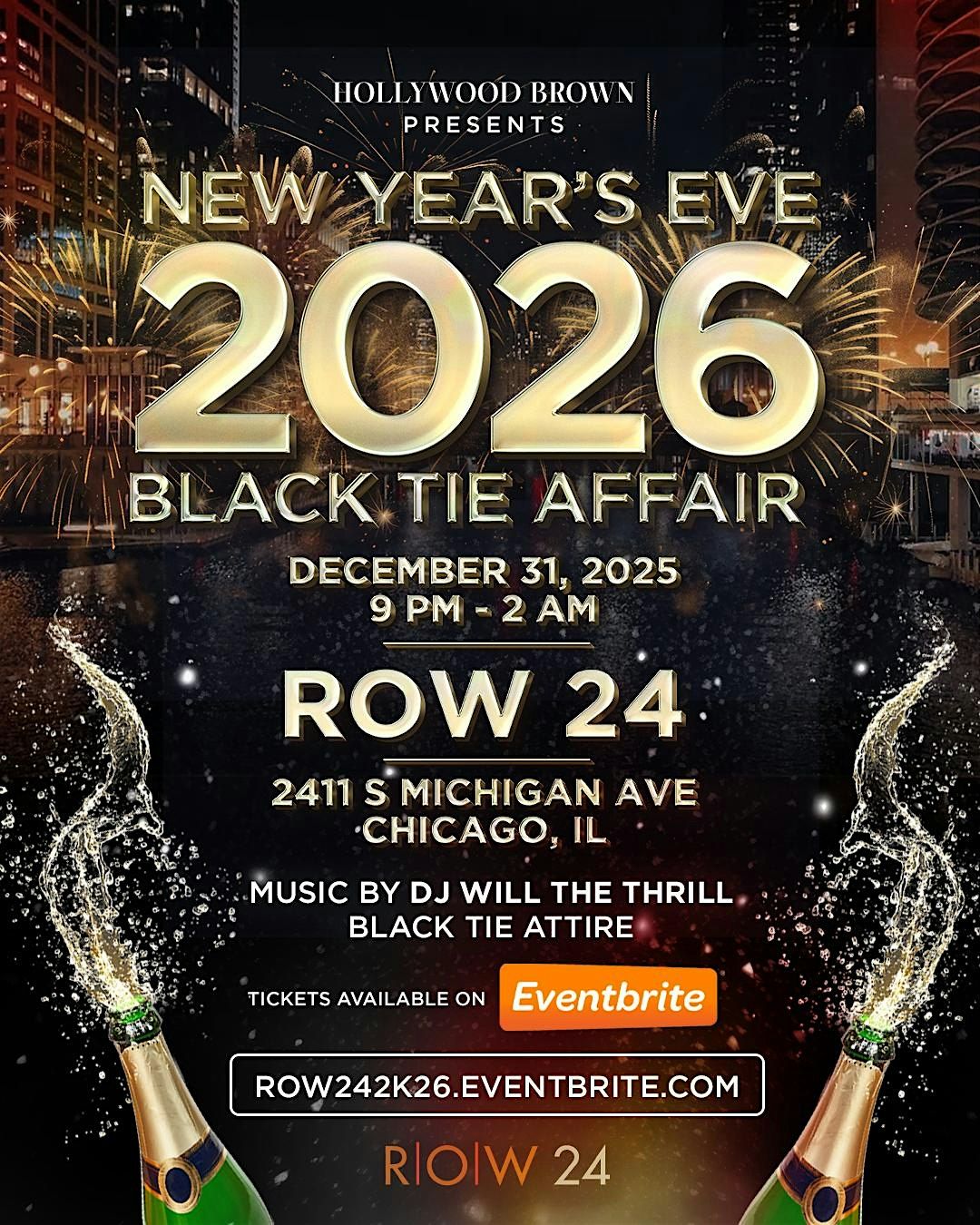 Hollywood Brown Presents New Year's Eve 2026 Black Tie Affair at Row 24 Chicago! Get ready to ring in the New Year in style on December 31, 2025 at 9:00 PM (Central Time). It's going to be a night to remember with amazing music by DJ Will The Thrill, delicious food for VIP guests, and great company. Don't miss out on this exclusive event!