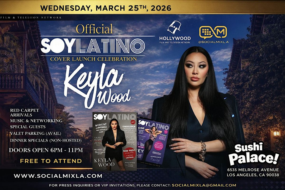 Social Mix Los Angeles, Hollywood Film and TV Mixer, and Soylatino Magazine cordially invite you to the Official SoyLatino Magazine Cover Launch Party honoring Actress Keyla Wood, celebrating her feature appearance on the cover of SoyLatino Magazine. Join us for an unforgettable evening of networking, celebration, and entertainment with industry professionals and rising stars.