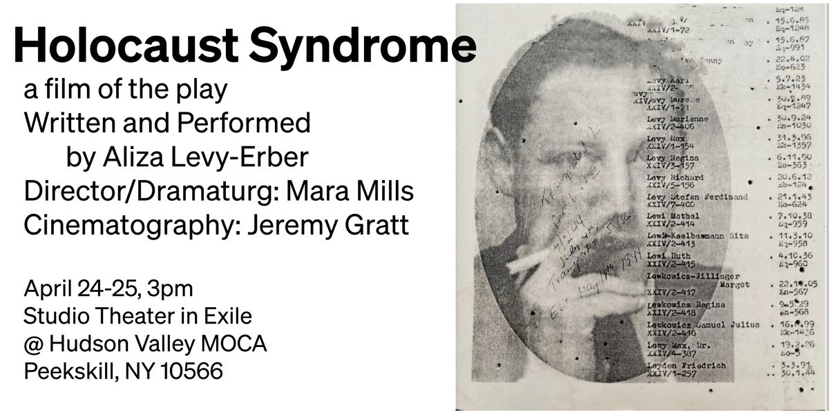 The film Holocaust Syndrome will be shown at Studio Theater in Exile @ Hudson Valley MOCA, 1701 Main Street, Peekskill, NY 10566, on April 25-26 , 3:00PM with a Q and A with Levy-Erber and Mills. Tickets: Tickets $20. Students $15.