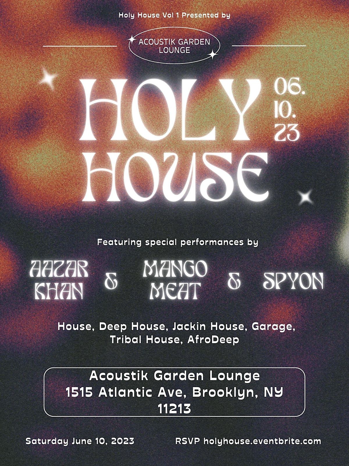 The Acoustik Garden Lounge invites you to come to celebrate the first-ever Holy House event! This is a new event series that explores the beauty of house music. Holy House is an experience that mixes house classics with modern-day house releases. While also exploring a plethora of subgenres within the house music world. You can expect performances from DJ Mango Meat during each iteration of Holy House while also featuring other up-and-coming and established DJs from the Manhattan and Brooklyn areas. Doors open at 9 pm and the event lasts until 2 am.