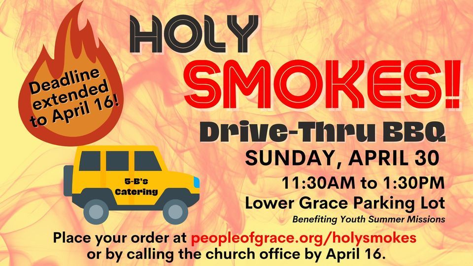 Delicious bar-b-q returns to Grace on Sunday, April 30. Holy Smokes is a drive thru bar-b-q featuring 5-Bs catering from Waterman, IL. The meat is smoked on the premises that day. All meals are served with baked beans, coleslaw, applesauce, roll, and butter. Holy Smokes takes place in the Lower Lot. Orders may be placed by visiting www.peopleofgrace.org/holysmokes by April 16. All proceeds will benefit the Youth Summer Mission Trip.#holysmokes #bbq #fundraiser