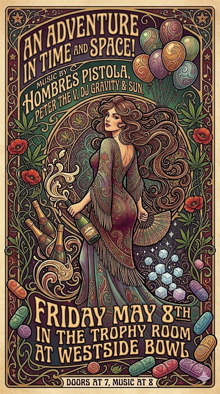 Come to the Westside Bowl for an Adventure in Time and Space with Hombres Pistola, Pete the V, and DJ Gravity & Sun!