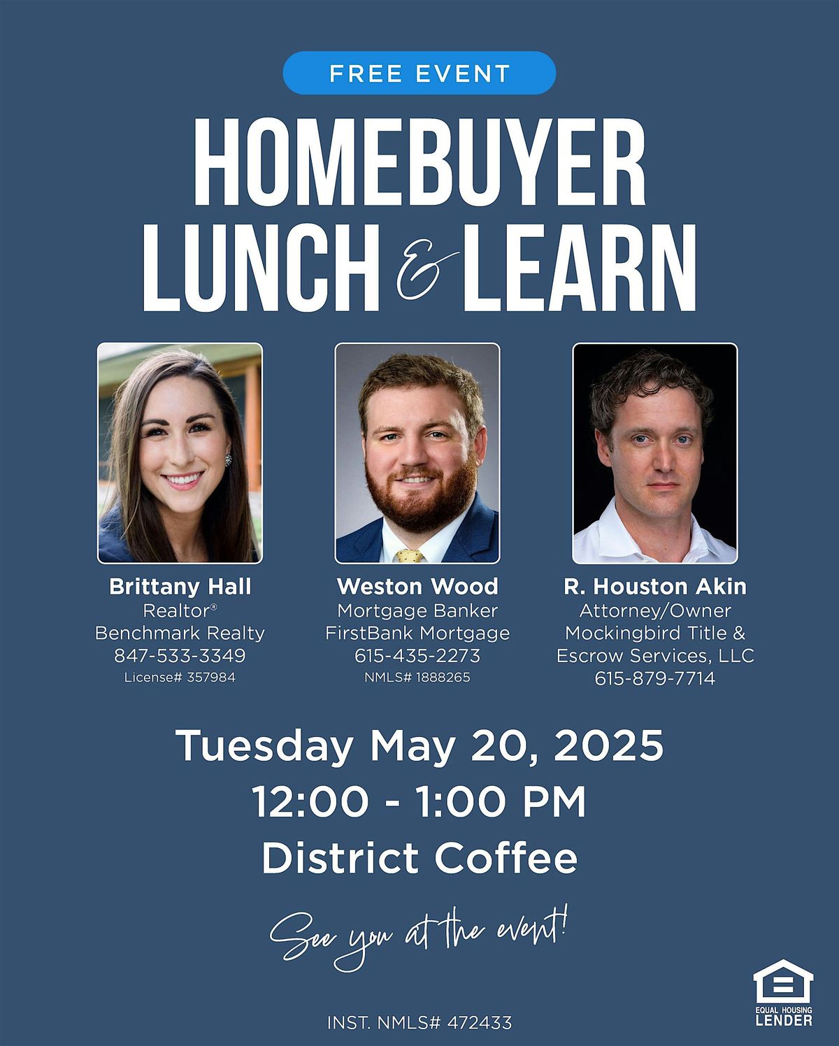 Join Realtor, Brittany Hall of Compass, Mortgage Banker, Weston Wood of First Bank, and Houston Aiken, Attorney at Mockingbird Title to go over the home buying process, what to expect, and how you can start to prepare NOW - whether you want to buy in 3 months or 3 years. We will also share helpful tips and tricks to help save you cash out of pocket at closing. With so many loan options & special programs, you may be closer to home ownership than you realize. Join us and walk away feeling empowered to achieve your home ownership goals!