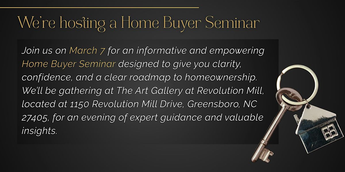 Join us on March 7 for an informative and empowering Home Buyer Seminar designed to give you clarity, confidence, and a clear roadmap to homeownership. We’ll be gathering at The Art Gallery at Revolution Mill, located at 1150 Revolution Mill Drive, Greensboro, NC 27405, for an evening of expert guidance and valuable insights. Don't miss out on this awesome chance to start your home journey with confidence!