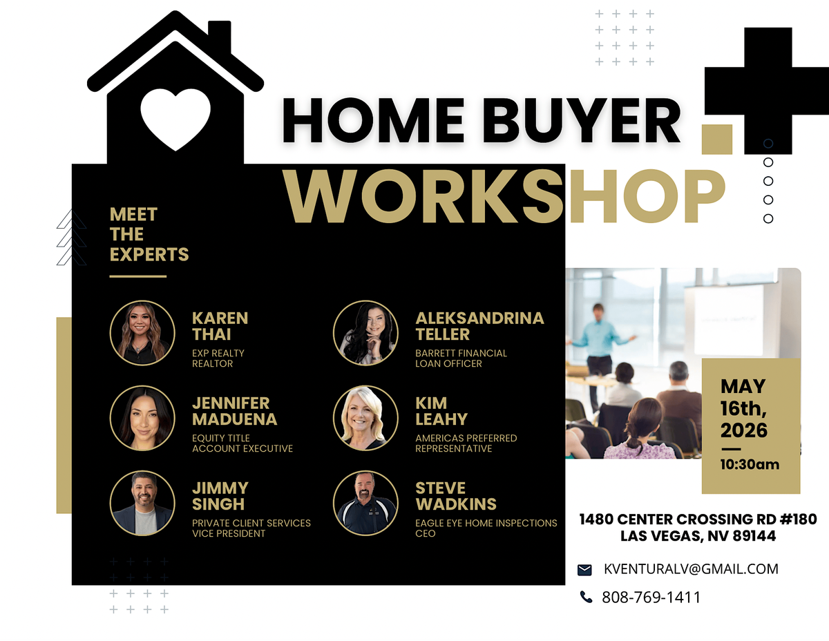 Join us for a fun and informal workshop all about buying your first home! Whether you're just starting to look or ready to make a move, we'll cover the basics and answer your questions. The event takes place on May 16, 2026 at 10:30 AM (Pacific Time) at 1480 Center Crossing Rd suite 180. Don’t miss out on this chance to get confident about home buying!