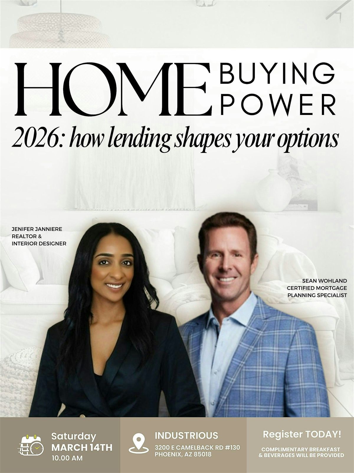 Home Buying Power 2026: How Lending Shapes Your Options is an education-first homebuyer event focused on helping buyers understand how today’s lending landscape impacts purchasing power, affordability, and the path to confident homeownership.Led by Sean Wohland, a top 1% mortgage loan originator nationwide, and hosted by Jenifer Janniere, a top 2% Arizona real estate agent, this conversation puts financing at the forefront, before the home search begins.Co-hosted in partnership with the Greater Phoenix Urban League Young Professionals in support of their Economic Empowerment Pillar, this fifth annual homebuyer event is designed to provide clarity, education, and actionable insight for buyers preparing to take the next step toward homeownership.