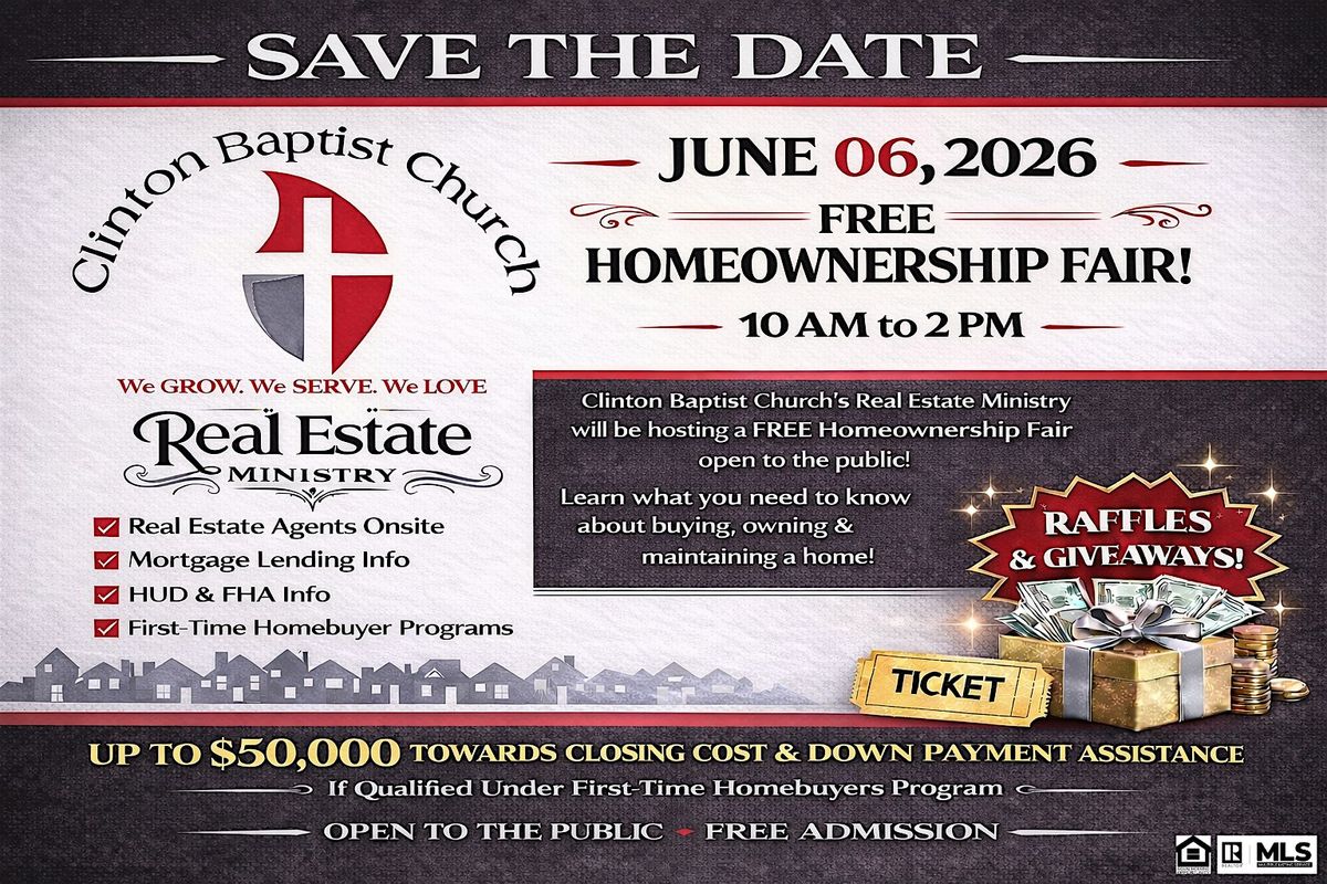 On Saturday, June 6, 2026, from 10:00 AM to 2:00 PM, our Real Estate Ministry will host a FREE Homeownership Fair here at Clinton Baptist Church.