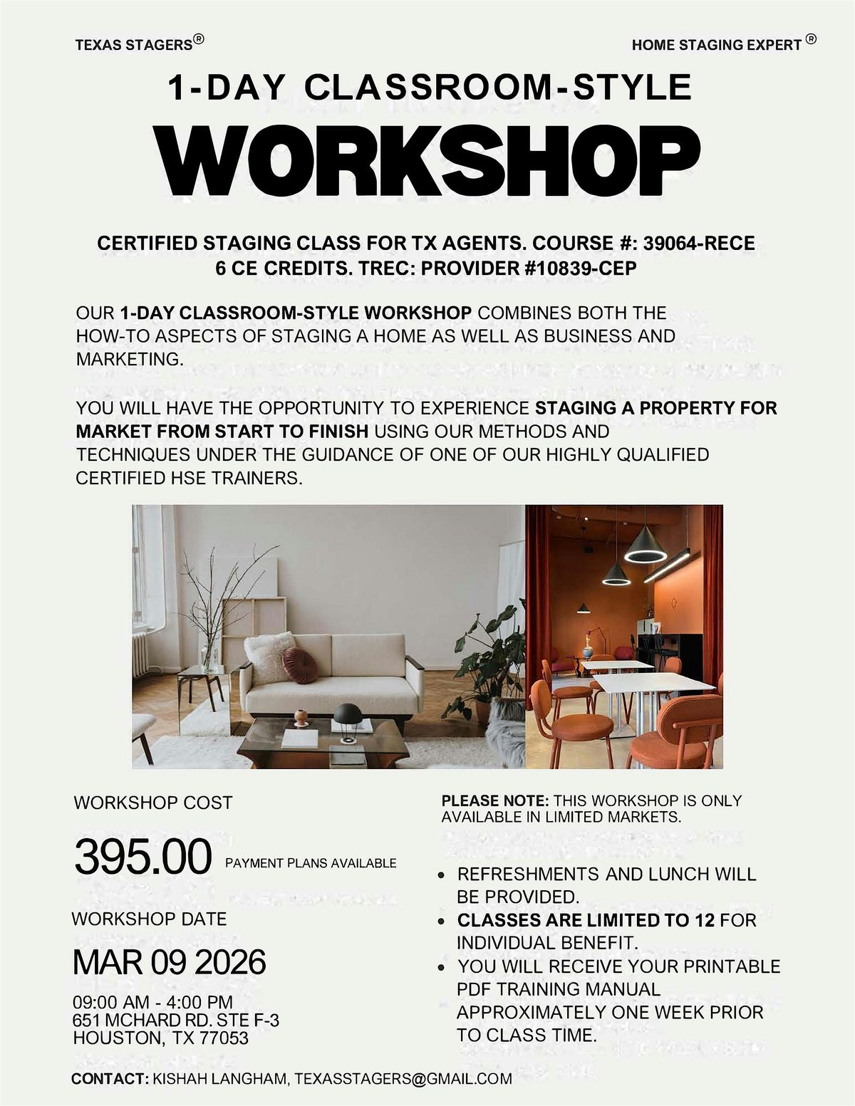 You will have the opportunity to experience staging a property for market from start to finish using our methods and techniques under the guidance of one of our highly qualified certified HSE trainer. Lunch is included and class manuals will be emailed the day before class.