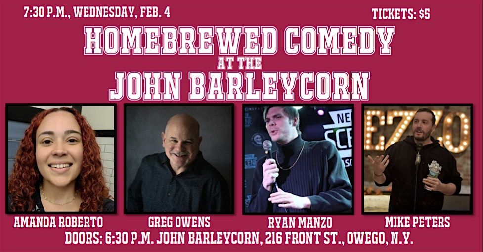 The laughter is coming to Owego when Homebrewed Comedy hits the stage at the John Barleycorn on Wednesday, Feb. 4. Greg Owens is headlining the show and Ryan Manzo and Amanda Roberto are joining host Mike Peters.