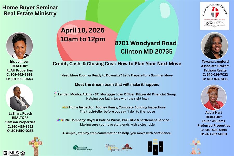 Clinton Baptist Church Real Estate Ministry will be hosting a Home Buyer Seminar on Saturday, April 18, 2026, from 10:00 AM to 12:00 PM here at Clinton Baptist Church, 8701 Woodyard Road in Clinton, Maryland.