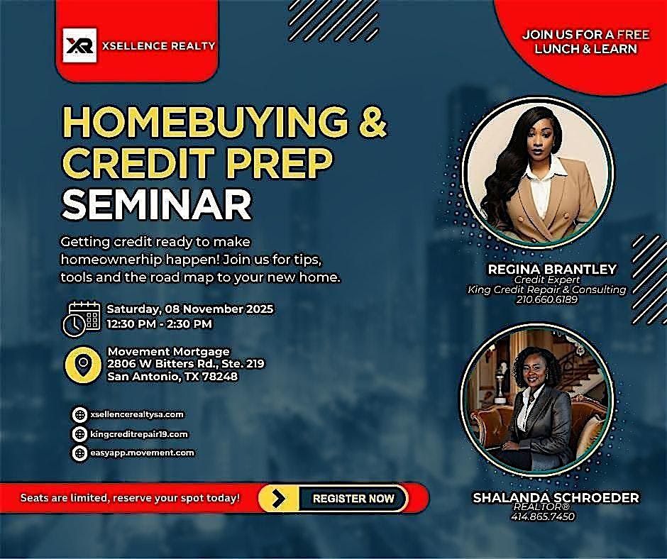 Welcome to the Homebuying & Credit Prep Seminar hosted by Shalanda Schroeder from Xsellence Realty and Regina Brantley from King Credit Repair & Consulting! Join us on November 8, 2025 at 12:30 PM (Central Time) to learn all about preparing for your home purchase and improving your credit score. You will learn valuable insights and tips to help you navigate the homebuying process with confidence. Don't miss this opportunity to take the first step towards your dream home! See you there!