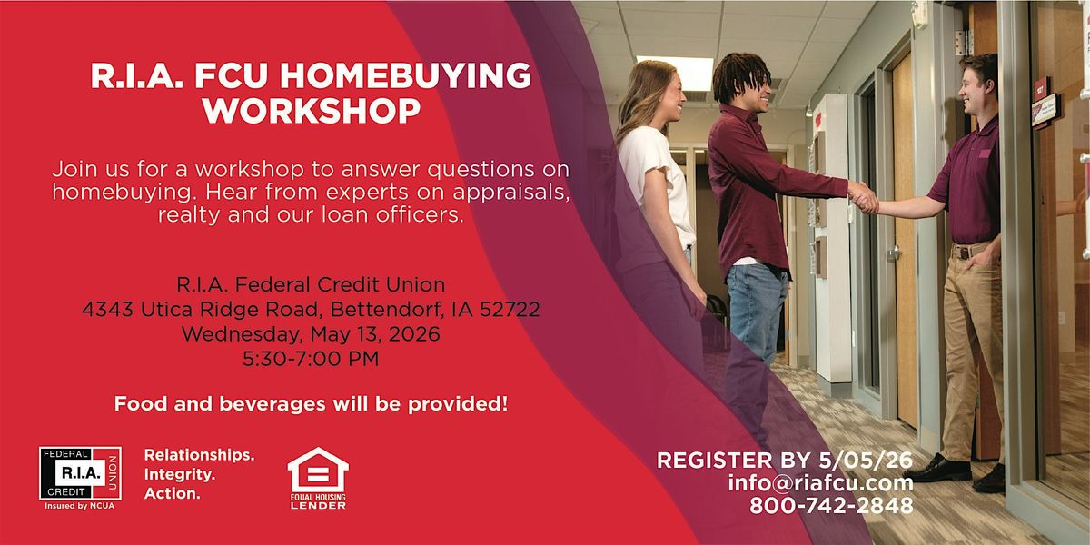 Join us for an exciting in-person event at R.I.A. Federal Credit Union on Utica Ridge Road! If you're a first-time homebuyer, or looking to learn more about the homebuying process, this workshop is perfect for you. Learn valuable tips and tricks from industry experts on how to navigate the real estate market with confidence. Discover the secrets to finding your dream home. Don't miss out on this opportunity to gain insider knowledge and make informed decisions. Mark your calendar for this must-attend event at 4343 Utica Ridge Road, Bettendorf, IA 52722. See you there!