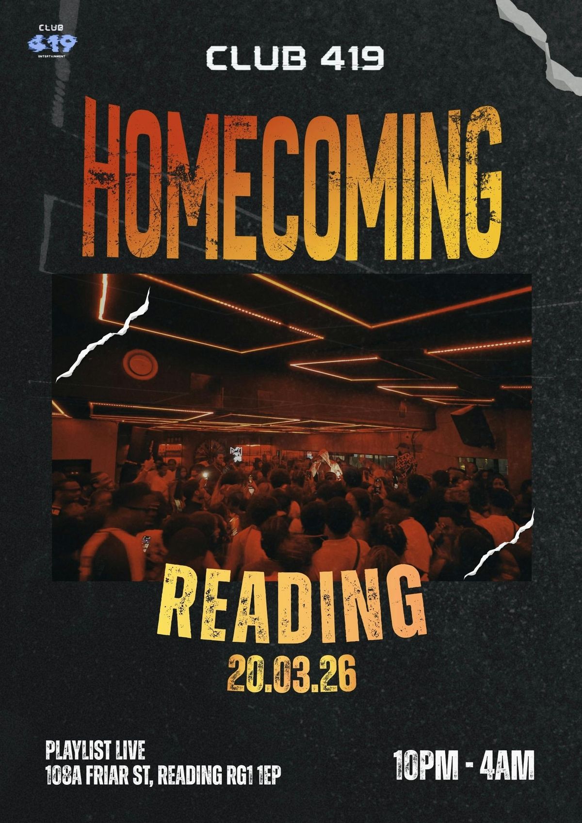 CLUB 419: HOMECOMING – READINGClub 419 is bringing the energy back home. On 20.03.26, we’re taking over Playlist Live for a late-night basement experience built for real vibes only.
