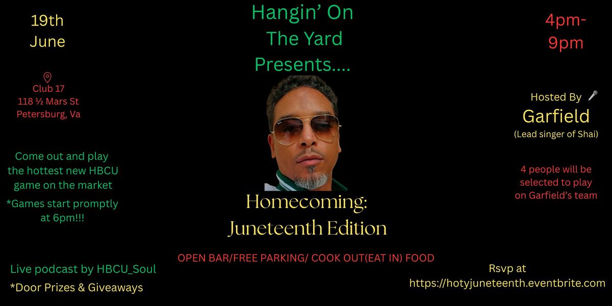 Come out and celebrate Juneteenth, Homecoming style. Join us as we eat, drink, and play Hangin' On The Yard, the hottest new game on the market. Hangin' On The Yard is an HBCU trivia game, with stroytellling, drawing, and singing categories. This event is hosted by Garfield(lead singer from Shai). There will be an open bar, cookout(eat in) food, and music. Come solo or bring your team. Come ready to play and have a great time. Calling all Greeks, HBCU alum, and anyone looking to have a great time. Remember, a homecoming is a family reunion, so everyone is welcomed!