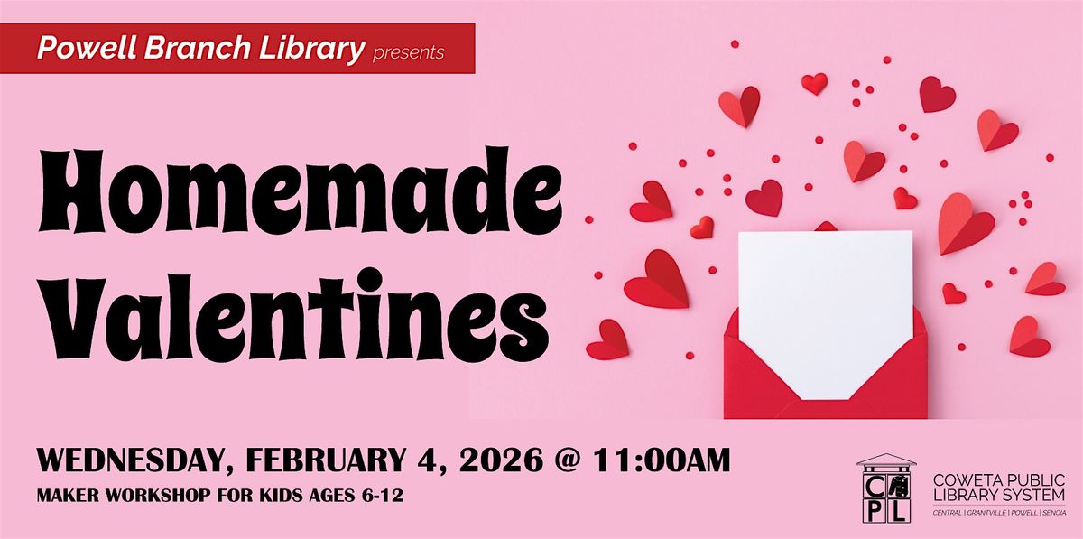 Kids will be guided through making homemade Valentines. We will use markers, watercolors, and glue to create three different Valentines. Ages 6-12.