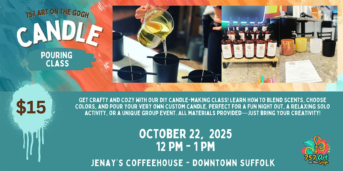 Come join us for a fun and creative afternoon of candle making ! Our friends from 757 Art on the Gogh will guide you through the process of making your very own custom candles. Whether you're a beginner or a seasoned crafter, this event is perfect for anyone looking to get hands-on and create something special. Don't miss out on this in-person event - grab your friends and unleash your inner artist!