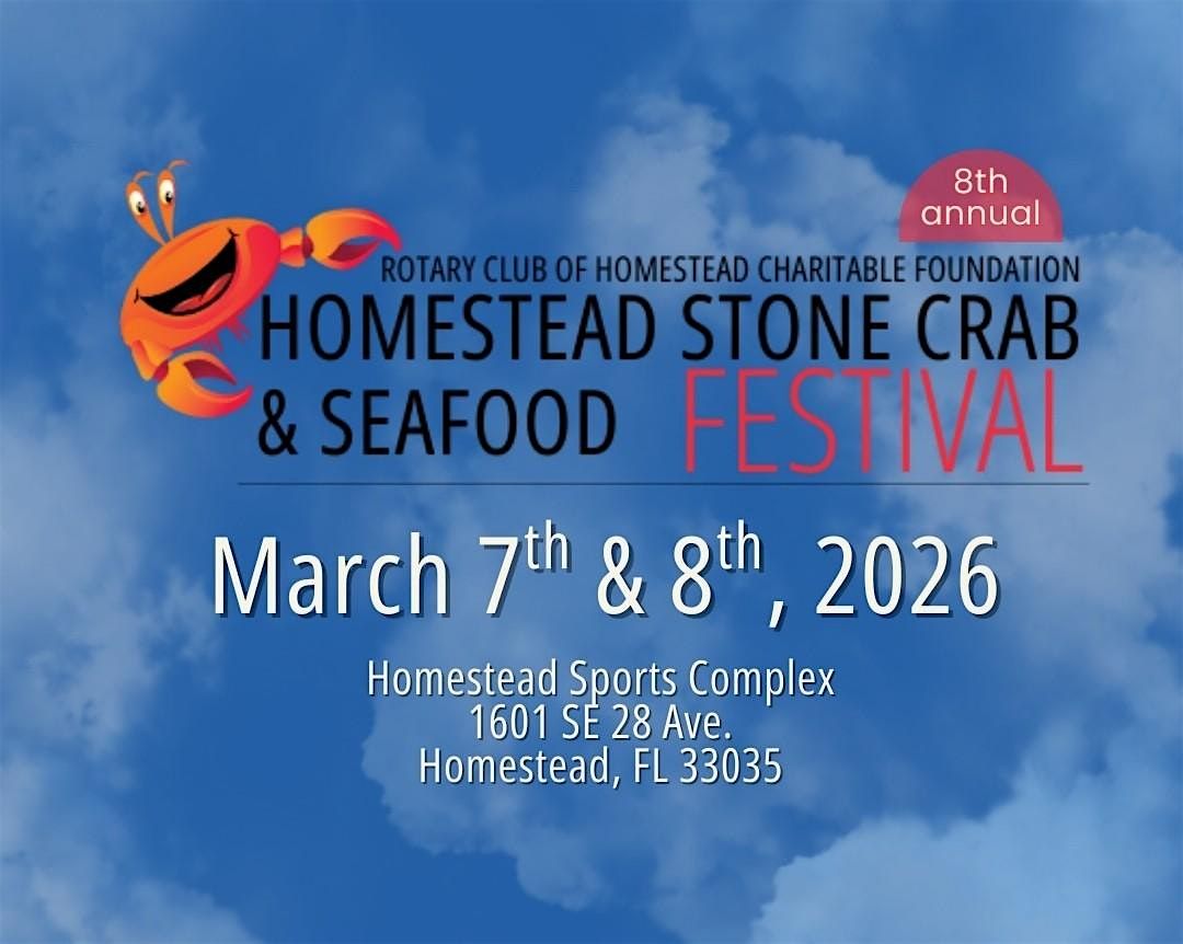 Join us at the 8th annual Rotary Club of Homestead Stone Crab & Seafood Festival, presented by the Rotary Club of Homestead Charitable Foundation (501(c)(3)).