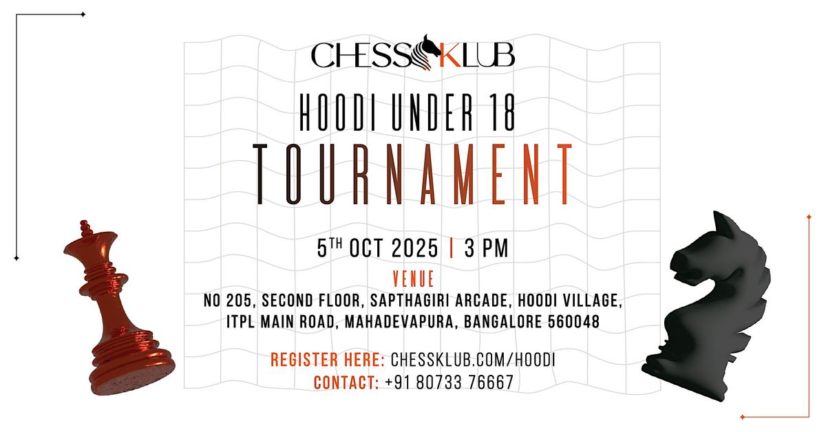 Join us for the Hoodi Under 18 Chess Tournament, an exciting platform for young chess players to test their skills, sharpen strategies, and enjoy competitive play. Organized by CHESS KLUB , this tournament is designed to bring together budding talents from across the city in a challenging yet fun environment.
