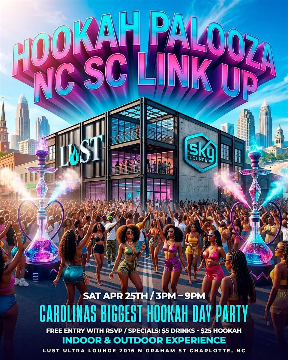 Saturday, April 25th, experience the BIGGEST hookah day party in the Carolinas as we take over Lust Ultra Lounge & Sky Lounge for a full indoor + outdoor vibe.
