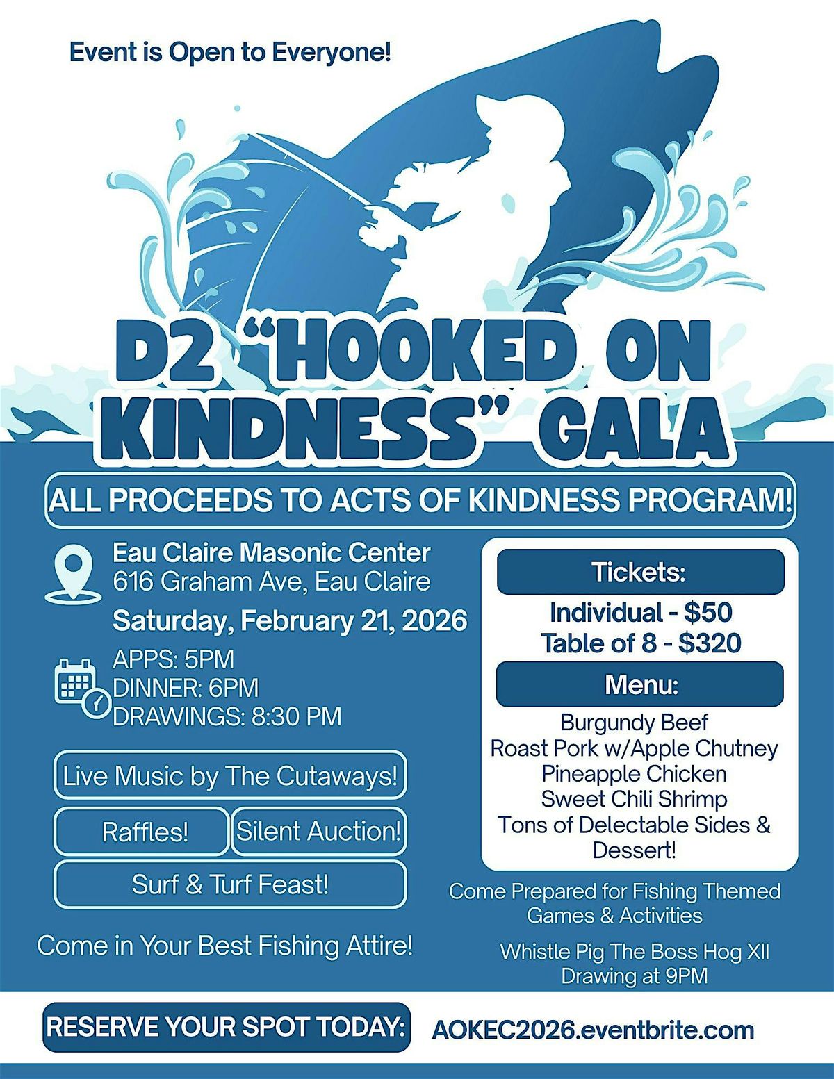 The Masonic Acts of Kindness Gala, โHooked on Kindness,โ is on Saturday, February 21, 2026, at the Historic Eau Claire Masonic Ballroom. Festivities include a Surf and Turf feast, live music by The Cutaways, silent auction, raffles, fishing-themed games, and immersive decor.