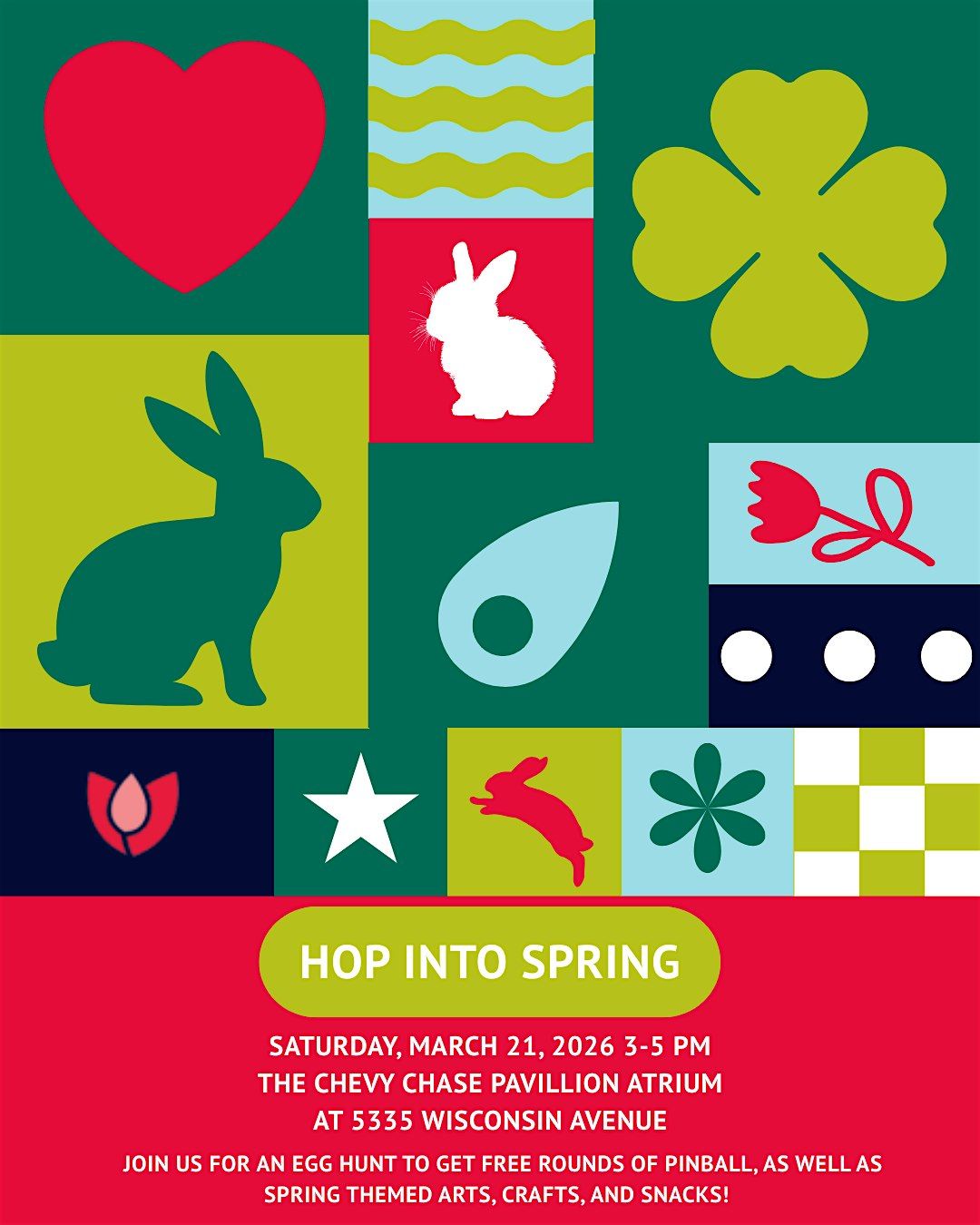 Participate in an egg hunt in partnership with VÜK Pinball to redeem free plays at their pinball machines, snack on some spring themed treats, and create colorful spring crafts to invite spring in! This event is organized by the Friendship Heights Alliance Youth Council, including students from BCC and Jackson Reed.